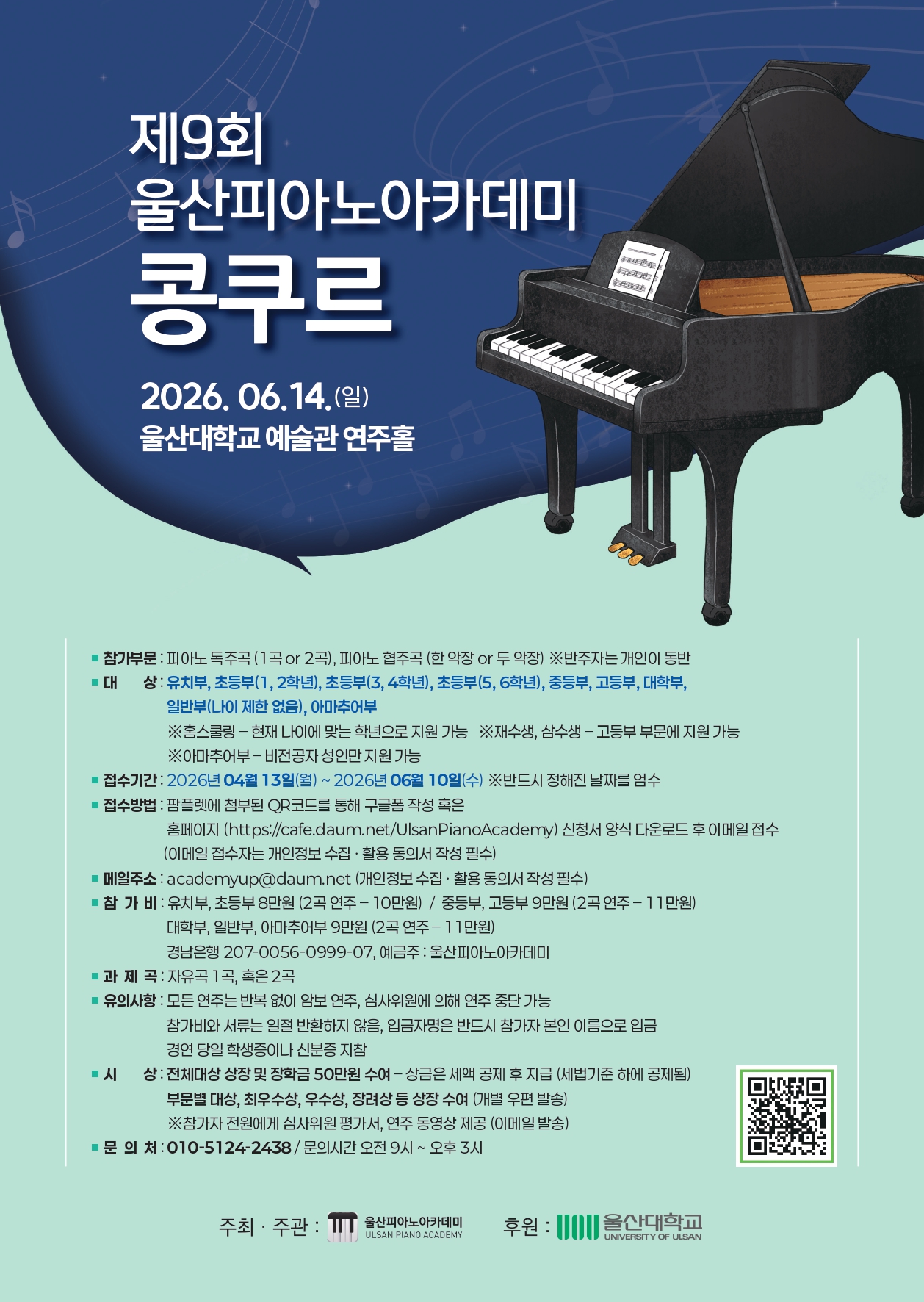 초등부 준대상 이상, 중·고·대·일반부 `1등이상에게 수상자 음악회 참가 기회가 부여됩니다.